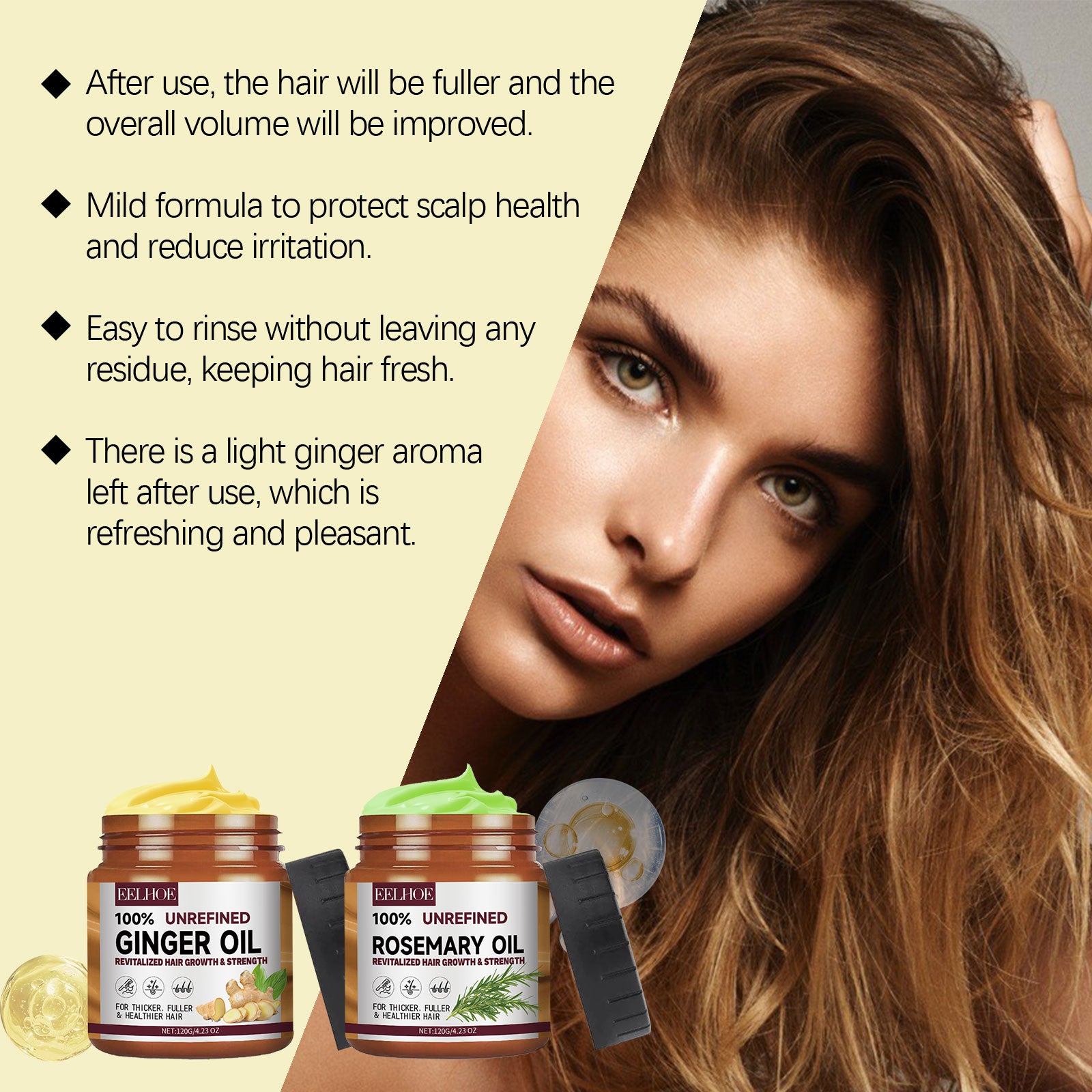- Revitalizing Ginger Extract: Boosts circulation and revitalizes dull, tired hair, providing a natural bounce and energy.